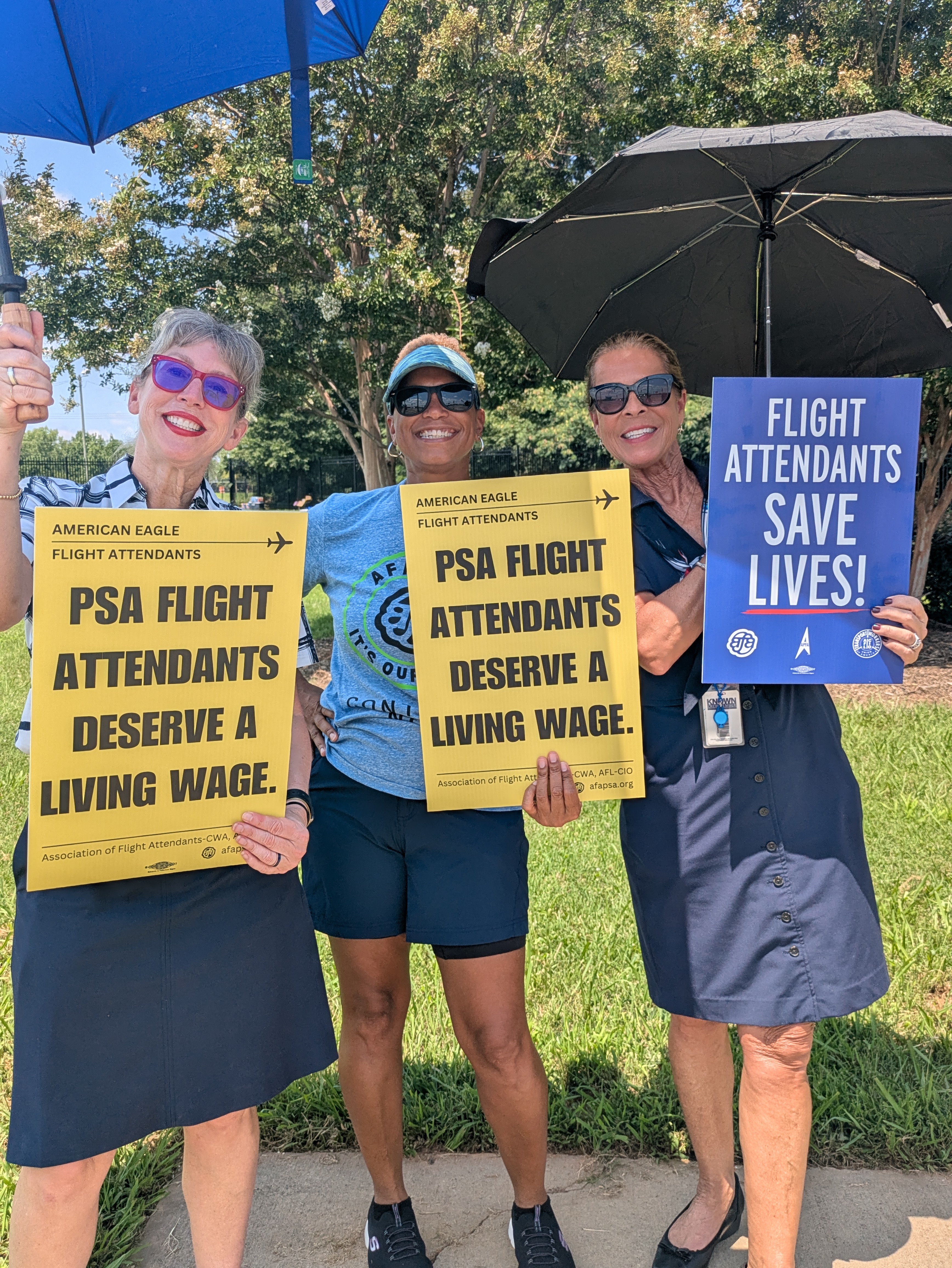 Flight attendants who work at PSA, a regional carrier of American Airlines, want to be paid for work inside the plane – not just in the air. They rallied Aug. 18 across from Charlotte Douglas International Airport to demand raises commensurate with the time they spend at work as opposed to when the plan is aloft.