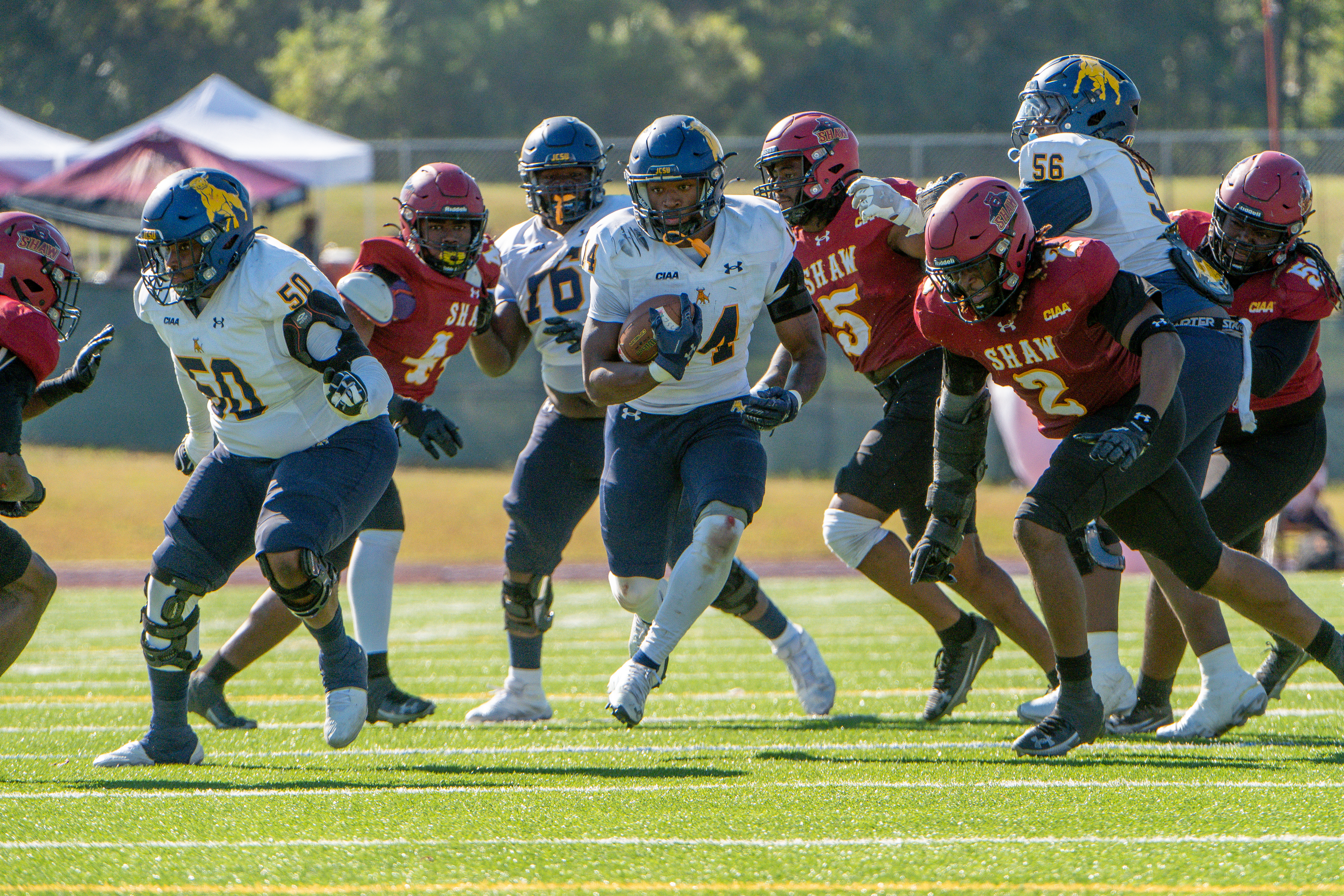 | J.C. Smith running back Bobby T. Smith (14) runs past Shaw defenders in the Golden Bulls’ 52-0 win against Shaw on Oct. 18, 2025 at Durham County Stadium. Smith, a redshirt freshman, is third in rushing yards among CIAA runners with 532 with five touchdowns on 110 carries. |