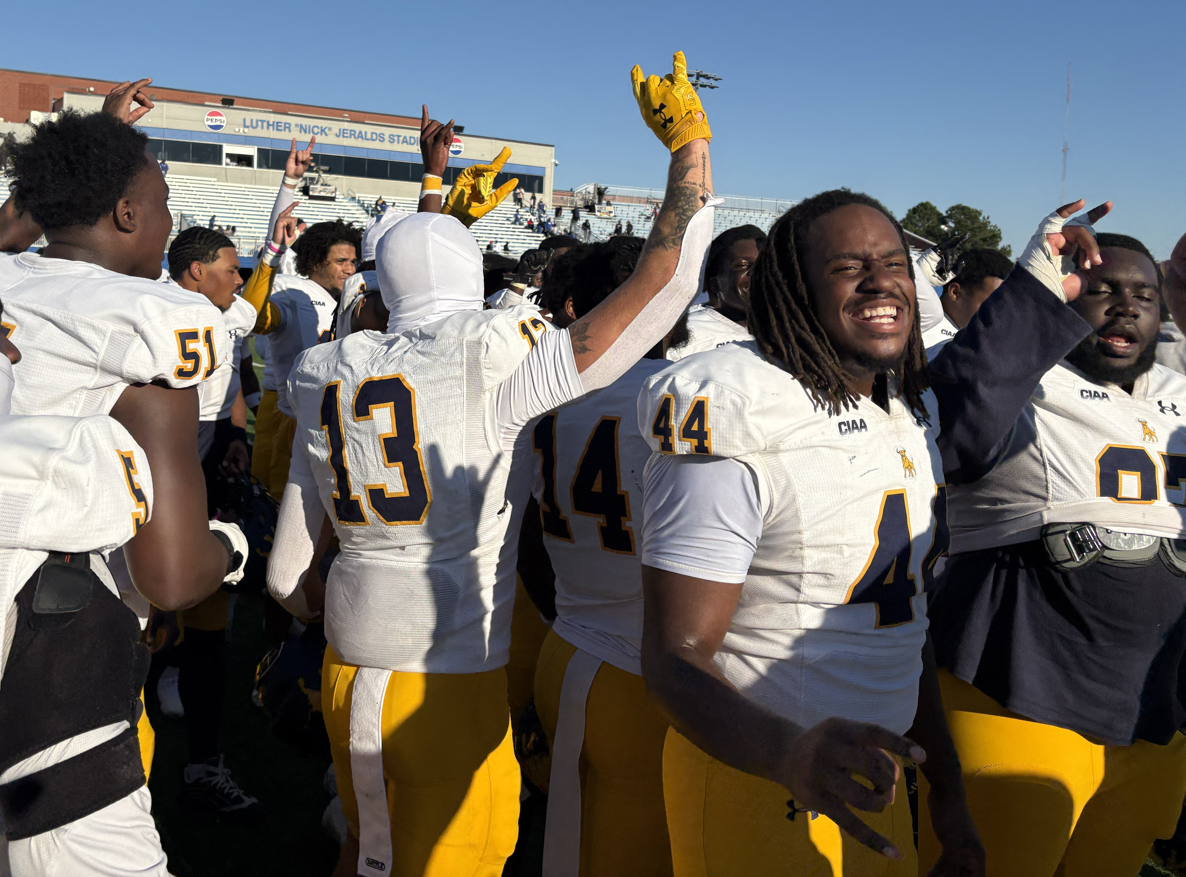 | Johnson C. Smith players celebrate after beating Fayetteville State 17-14 Nov. 1, 2025. The Golden Bulls improved to 8-1, 5-1 in the CIAA with the win and can set a single season wins record with a victory next week against Livingstone. |
