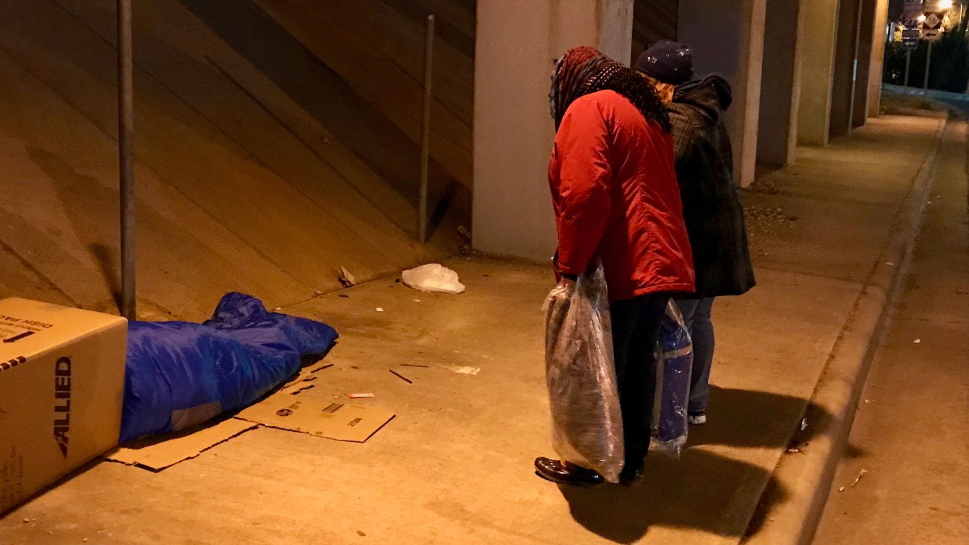 | Volunteers with the Mecklenburg County Point in Time homeless census check on a person at a Charlotte overpass in 2023. Black people made up 73% of the county's homeless in 2025, a 3% drop compared to 2022. |