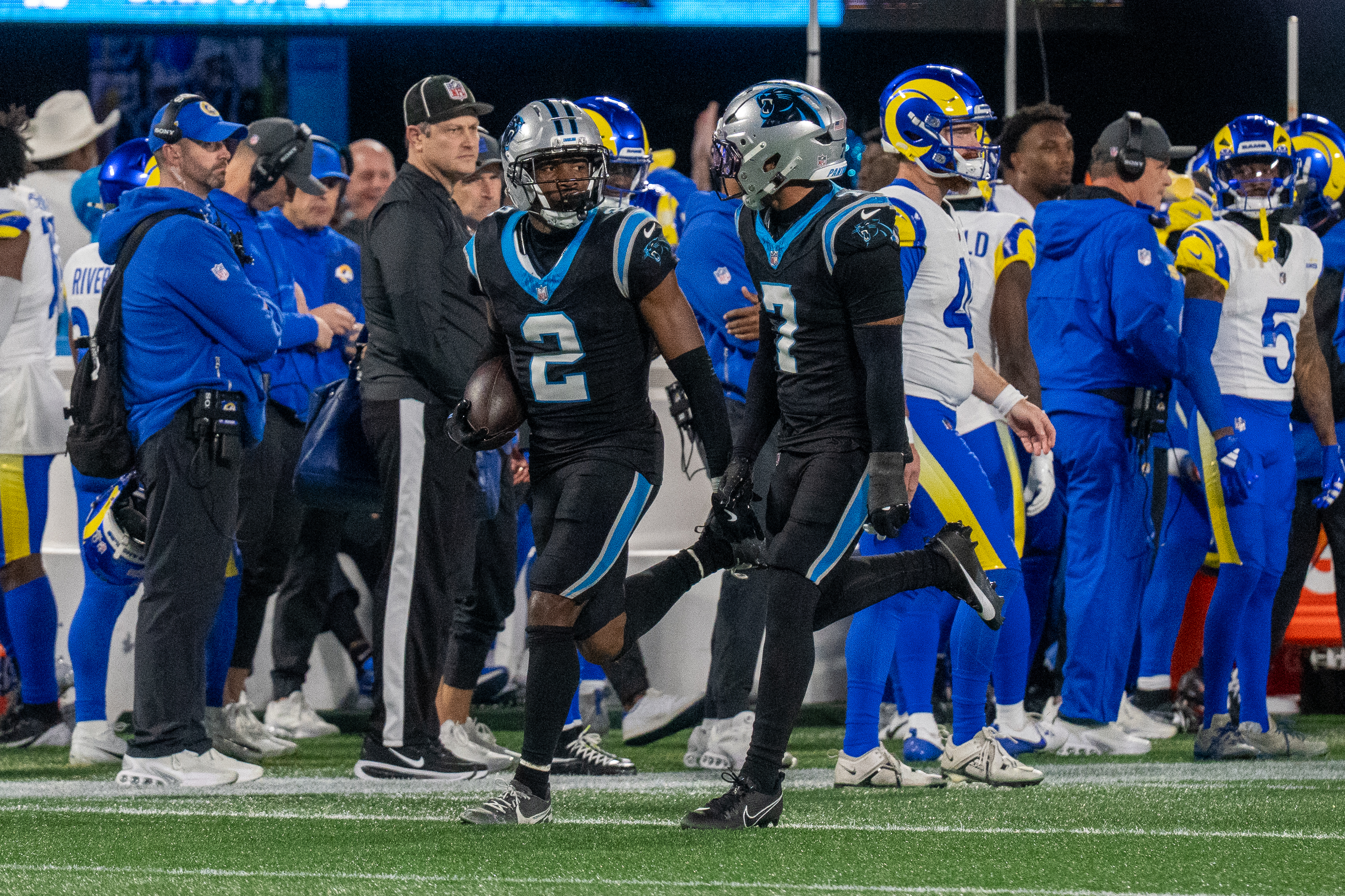 | Carolina Panthers cornerback Mike Jackson (2) celebrates his interception against the Los Angeles Rams with teammate Tre'von Moehrig in their 34-31 loss in the NFC Wild Card round on Jan. 10, 2026, at Bank of America Stadium. |