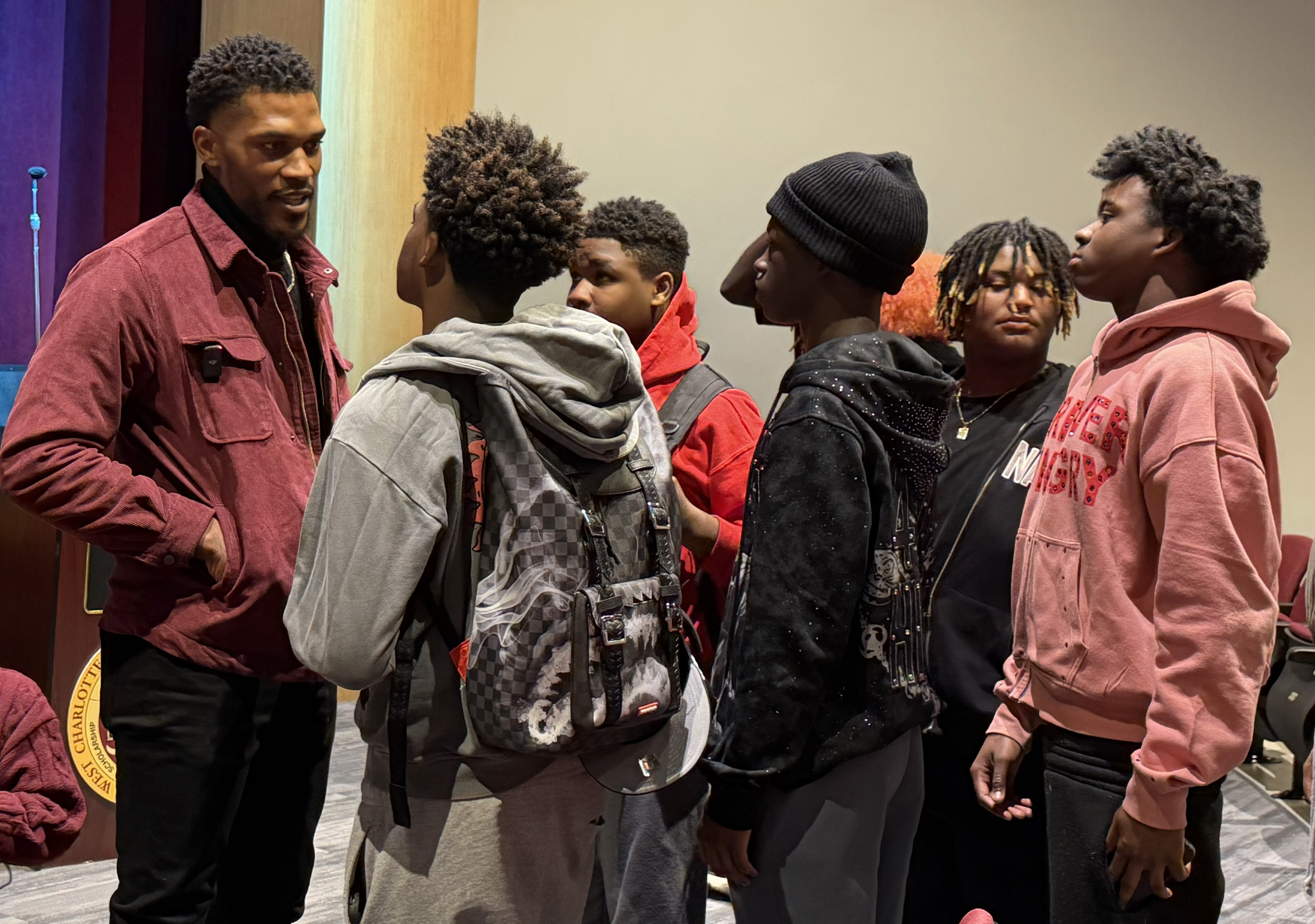 | West Charlotte High football coach D.J. McFadden speaks with junior varsity players on Jan. 21 during a campus meet-and-greet. McFadden, who coached at Independence for five years, succeeds Sam Greiner. |