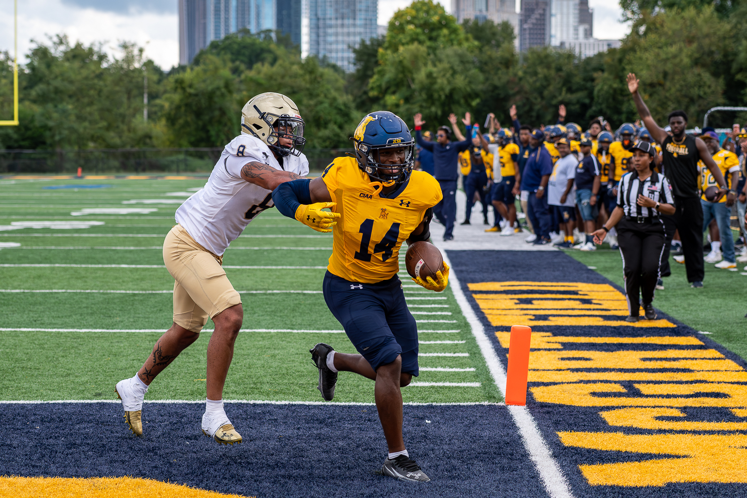 | Johnson C. Smith running back Bobby Smith scores on a 14-yard pass against Bluefield State in the Golden Bulls’ 69-13 win on Sept. 27, 2025. JCSU opens the 2026 season at Benedict Aug. 29 and Albany State Sept. 6 in the Black College Football Hall of Fame Classic in Canton, Ohio. |