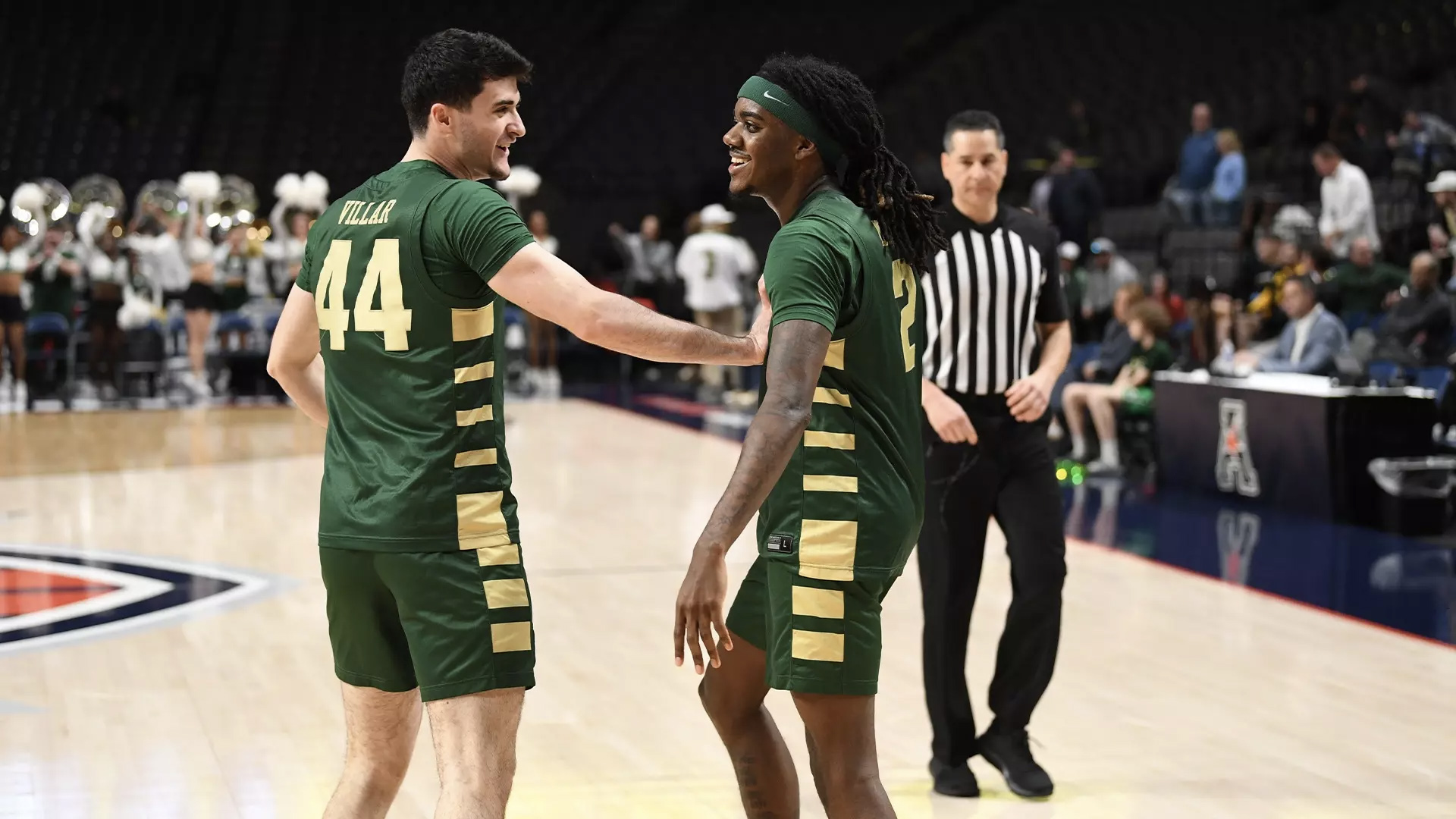 | Charlotte guards Raúl Villar and Dezayne Mingo celebrate the 49ers' 83-78 win against Alabama-Birmingham in the American Conference tournament quarterfinals Friday in Birmingham, Alabama. The No. 5 seed 49ers take on top seed South Florida in Saturday's semifinal. |