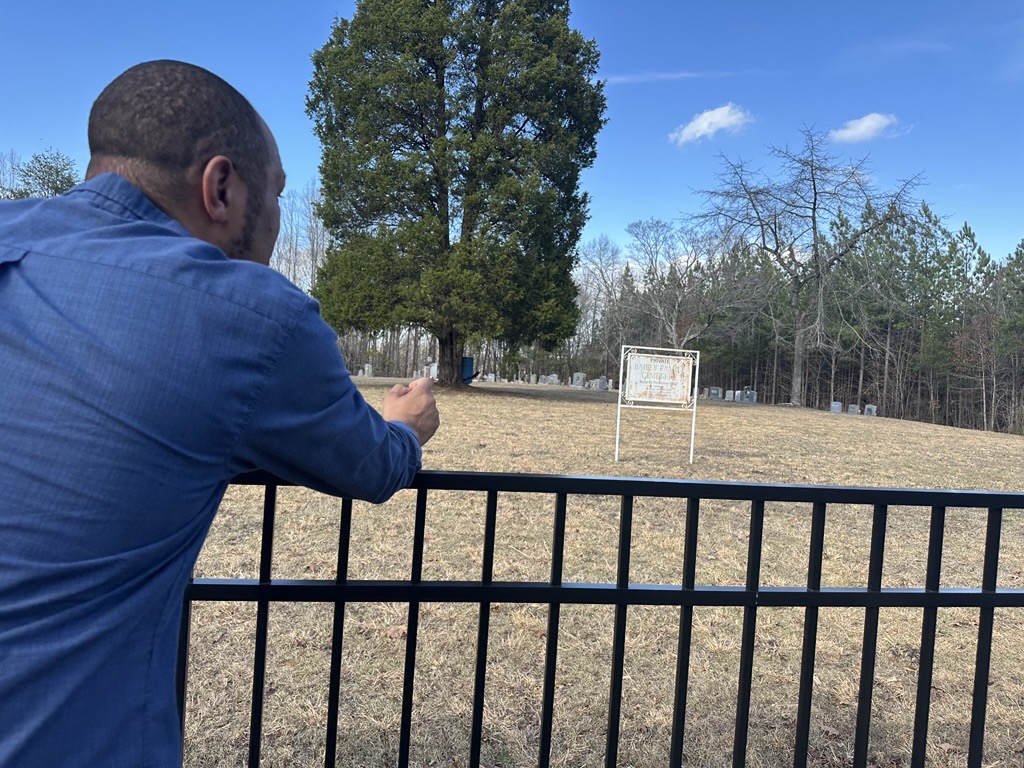 | Chad Bailey leans against the fence at the Baileytown cemetery in Stokes County, North Carolina. The cemetery sits on property county commissioners rezoned for a data processing center. |