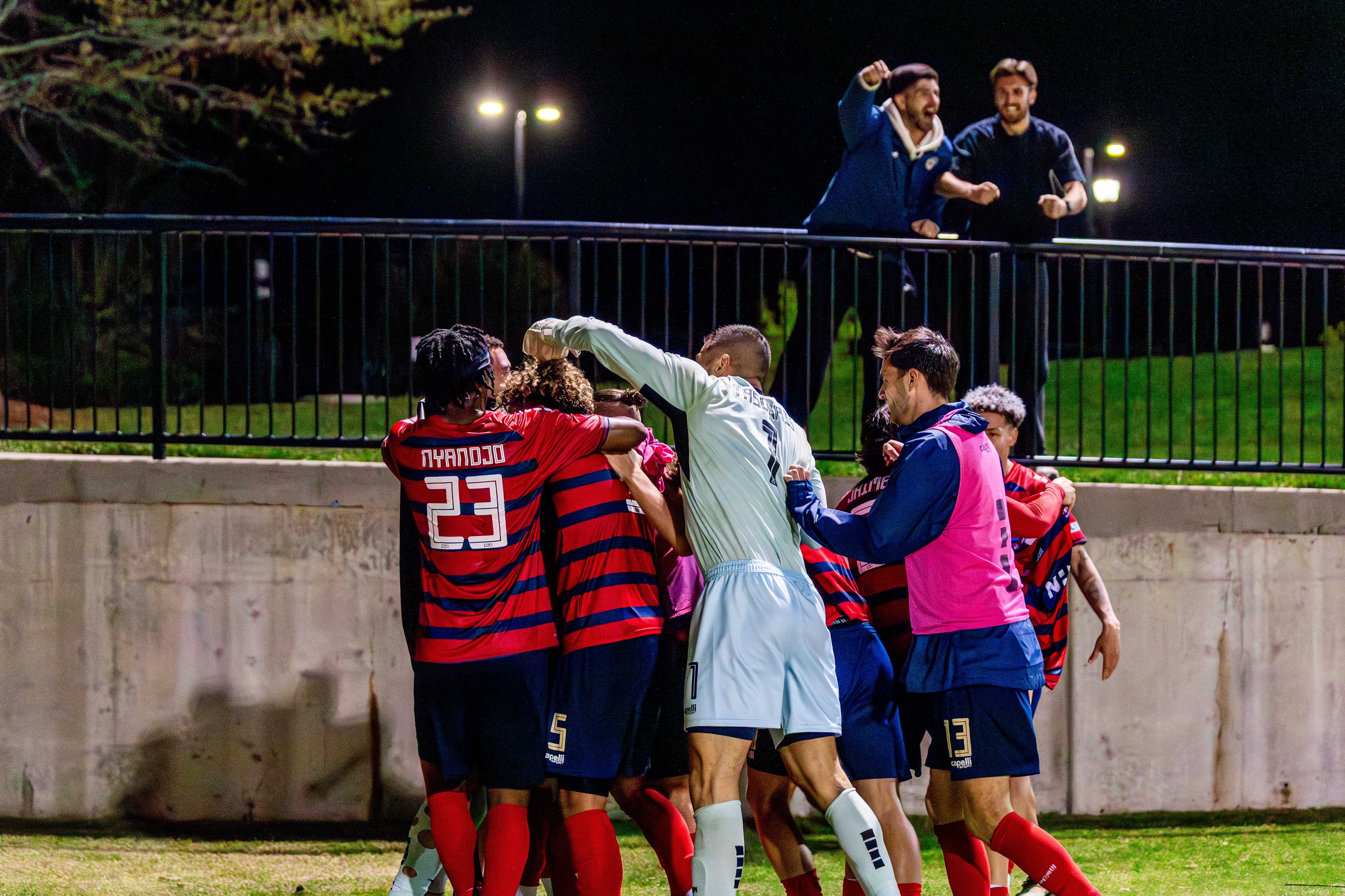 | Charlotte Independence players celebrate after a goal in their 3-2 win against Charleston Battery at the Sportsplex in Matthews on March 31, 2026. The Independence advanced to the third round of the Lamar Hunt U.S. Open Cup. |